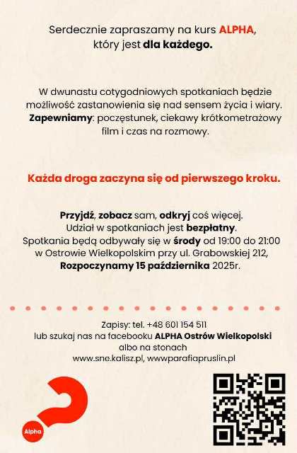 Serdecznie zapraszamy na kurs ALPHA, który jest dla każdego. W dwunastu cotygodniowych spotkaniach będzie możliwość zastanowienia się nad sensem życia i wiary. Zapewniamy: poczęstunek, ciekawy krótkometrażowy film i czas na rozmowy. Każda droga zaczyna się od pierwszego kroku. Przyjdź, zobacz sam, odkryj coś więcej. Udział w spotkaniach jest bezpłatny. Spotkania będą odbywały się w środy od 19:00 do 21:00 w Ostrowie Wielkopolskim przy ul. Grabowskiej 212. Rozpoczynamy 15 października 2025r.
